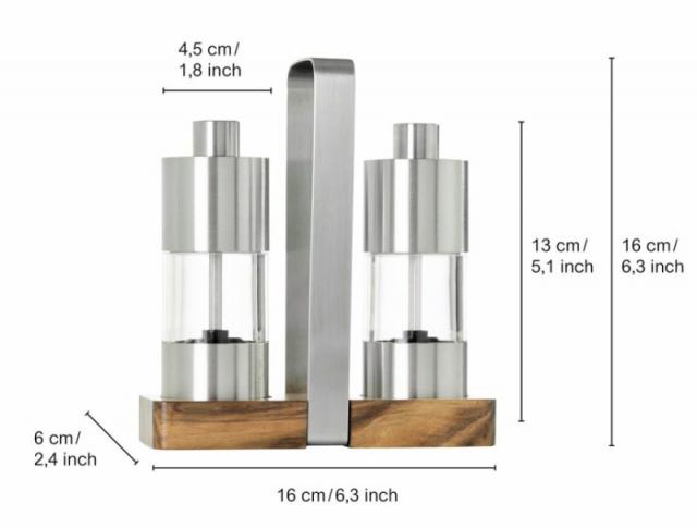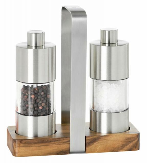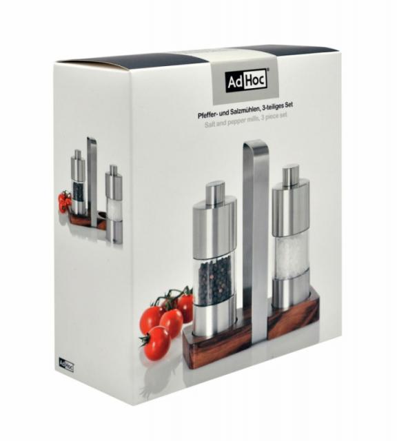 Edles Design für den Esstisch: Ad Hoc Pfeffer- und Salzmühlen „MENAGE“ Mit der Ad Hoc Pfeffer- und Salzmühlen „MENAGE“ erhalten Sie einen echten Hingucker für Ihre Familientafel. Das Set besteht aus zwei Mühlen in silbernem Edelstahl auf einem Träger aus Akazienholz. Die beiden Mahlgutcontainer aus klarem Acryl erlauben jederzeit den Blick auf den Füllstand. Lange Freude bereitet das stufenlos verstellbare Hochleistungskeramikmahlwerk. Mit Maßen von D/H ca. 6 x 16 cm (Gewicht 0,65 kg) benötigt die Menage nur wenig Platz auf dem Tisch. Schnappen Sie sich die Ad Hoc Pfeffer- und Salzmühlen „MENAGE“ und bestellen Sie online! Angaben zum Hersteller AdHoc Entwicklung und Vertrieb GmbH Im Pfeifferswörth16 68167