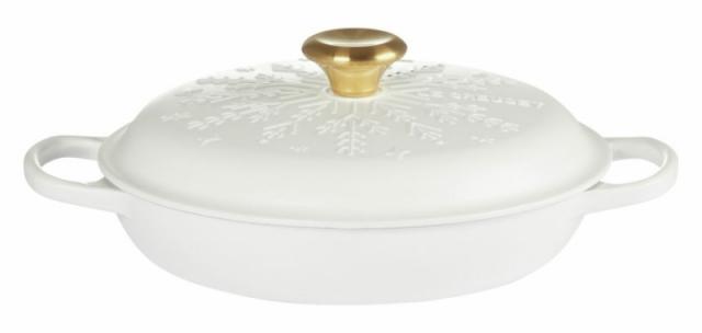 Le Creuset Gourmet Profitopf 26 cm mit Wintermotiv Der Le Creuset Gourmet Profitopf 26 cm strahlt mit seiner Schneeflocken-Prägung auf dem gusseisernen Deckel sowie dem goldenen Knauf festlichen Winterzauber aus. Der backofengeeignete und gefrierfähige Topf besteht aus weiß emailliertem Gusseisen ist kratzfest und leicht zu reinigen. Seine hervorragenden wärmeleitenden Eigenschaften finden auf allen modernen Herden Anwendung. Nutzen Sie das D ca. 26 cm große und 2,63 kg schwere Modell mit 2,2 l Fassungsvermögen, um Ihrer Familie leckere Eintopfgerichte und Braten zuzubereiten. Verzichten Sie nicht auf den Le Creuset Gourmet Profitopf 26 cm!