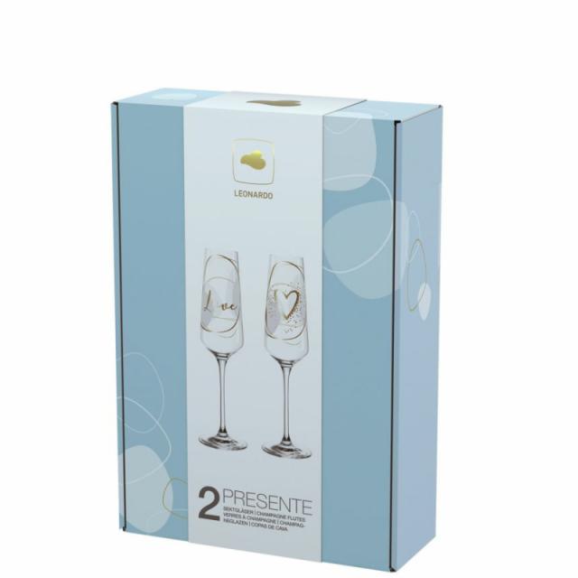 Im klassischen Flötendesign veredeln die Leonardo Sektgläser 2er-Set „LOVE PRESENTE“ besondere Events.Trotz schönem goldenem Motivdruck ist das hochwertige Klarglas-Set (0,4 kg) spülmaschinenfest. Das B/H/T ca. 21 x 30,7 x 7,8 cm große Set beinhaltet zwei Gläser mit 0,28 Liter Füllmenge. Angaben zum Hersteller Glaskoch B. Koch jr. GmbH + Co. KG Industriestraße 23 33014 Bad Driburg