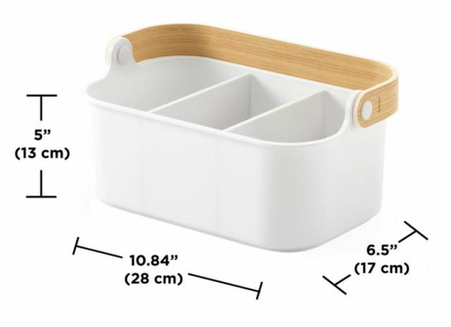 Umbra Aufbewahrungsbehälter „BELLWOOD“ mit Henkel Ordnung in Ihrer Küche oder im Bad schaffen Sie mit dem praktischen Umbra Aufbewahrungsbehälter „BELLWOOD“. Der hübsche weiße Kunststoffbehälter passt mit seinen Maßen von B/H/T ca. 28 x 13 x 17 cm perfekt auf jede Ablage. Modern und heimelig wirken die abgerundeten Ecken. Das Innere der Box unterteilen zwei herausnehmbare Trennstücke variabel. Außerdem erleichtert dies bei Bedarf die Reinigung. Am klappbaren Henkel aus Kunststoff in naturbraunem Holzdekor lässt sich der 0,42 kg leichte Behälter samt Inhalt problemlos transportieren. Verwahren Sie Dosen, Flaschen oder Reinigungsmittel platzsparend und ordentlich im Umbra Aufbewahrungsbehälter „BELLWOOD“!